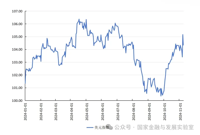 2024年7月1日至11月7日,美元指数总体在100-106的区间内波动。该时期,美元指数走势呈现“V型”的两阶段走势(见图1)。第一阶段为2024年7月1日至9月24日,美元指数从105.81下降至100.35,贬值幅度为5.2%。第二阶段为2024年9月24日至11月7日,美元指数从100.35上升至104.34,升值幅度为4%。