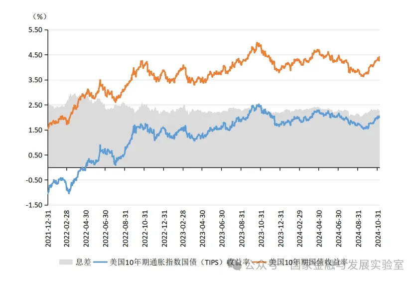 就美国通胀预期而言,美国10年期通胀指数国债(TIPS)收益率通常被看作美国国债的实际收益率指标,其与美国国债名义收益率之差,被投资者看作美国年通胀率的预期。在2024年11月6日,美国10年期通胀指数国债(TIPS)收益率为2.04%;美国10年期国债收益率为4.42%,这意味着盈亏平衡通胀率(二者息差)已经接近2.38%。而在2024年9月16日,二者息差为2.09%。投资者对美国通胀预期的上升带动美国10年期国债收益率的上升。美国10年期国债收益率从2024年9月16日的3.63%,上升至2024年11月6日的4.42%,上升了79个基点(见图6)。