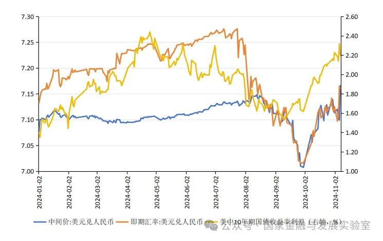 其一,中国央行逐渐淡出逆周期因子的使用。2024年7月1日至8月4日,人民币兑美元汇率的中间价和即期汇率(收盘价)的走势呈现明显的收敛趋势。2024年8月5日至11月7日,人民币兑美元汇率的中间价和即期汇率(收盘价)的偏离程度收窄,二者走势几乎完全趋同(见图4)。这表明,中国央行在2024年第三季度开始减少对汇率波动的干预,逐渐淡出逆周期因子的使用。