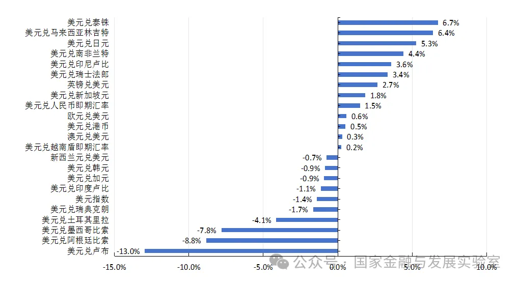 ■2024年第三季度,美元指数“V型”走势整体主导了全球外汇市场的变化。泰铢、马来西亚林吉特、日元、南非兰特、印尼卢比、瑞士法郎、英镑等国家货币对美元呈现升值行情;卢布、阿根廷比索、墨西哥比索、土耳其里拉、瑞典克朗等国家货币对美元则呈现贬值格局。