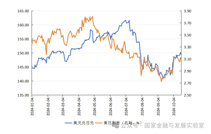 美日经济周期与货币政策分化导致美日利差扩大,是日元兑美元汇率变动的主要原因。一方面,美联储开始降息。2024年9月和11月,美联储累计降息75个基点,将联邦基金利率降至4.5%-4.75%的区间;另一方面,日本央行开始加息。2024年3月19日,日本央行将政策利率由-0.1%提高至0%-0.1%;2024年7月31日,日本央行将政策利率由0%-0.1%提高至0.25%。受此影响,2024年第三季度的美日利差较2024年年初有所收敛,总体在2.7%-3.4%的区间内波动。从走势来看,日元兑美元汇率与美日利差变动呈现明显的正相关关系(见图3)。未来一段时间,美国和日本货币政策走向依然是影响日元兑美元汇率走势的重要考量。