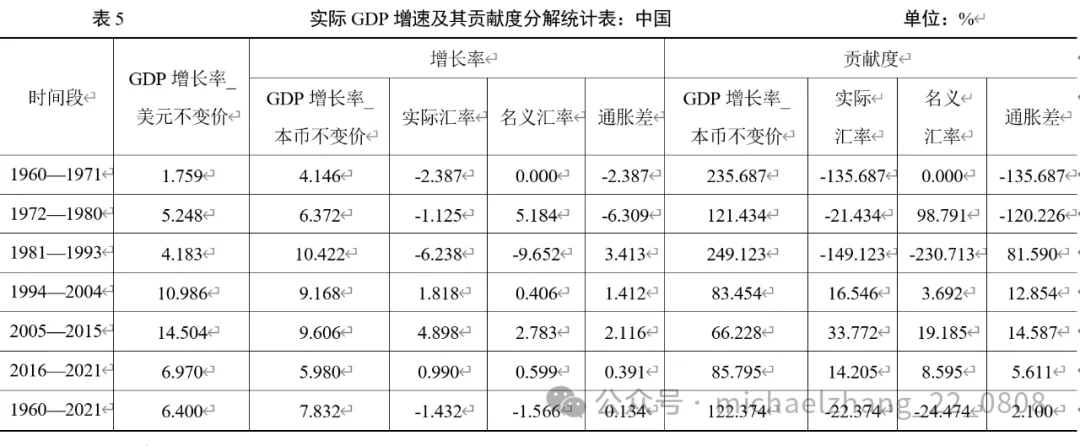 1960—2021年中国实际GDP增速及其分解结果如附录2所示。以人民币汇率走势及制度改革为分界点,本文样本进一步分为六段,分别计算了每一段内的年度平均增速及其分解情况,如表5所示。总体来看,中国为经济实力主导型经济体,实际汇率贡献度为负。样本期内以人民币计价的中国年均实际GDP增长率为7.83%,同期内全球排名位居全球首位;但美元兑人民币汇率由0.406贬值至0.155,年均贬值幅度为1.56%,考虑到中美间相对稳定的通货膨胀率,人民币实际汇率轻微贬值1.43%,在一定程度上侵蚀了国内经济增长的成果,最终导致中国以美元计价的年均实际GDP增长率为6.4%,排名位居全球62位。不论哪一时段,中国都是经济实力主导型经济体,实际汇率贡献度或为负,或为较小的正值。根据实际汇率贡献度,可以将时间段分为三个阶段:1960—1993年,实际汇率贡献度显著为负阶段;1994—2015年,实际汇率贡献度显著为正阶段;2016—2021年,实际汇率贡献度小幅波动阶段。