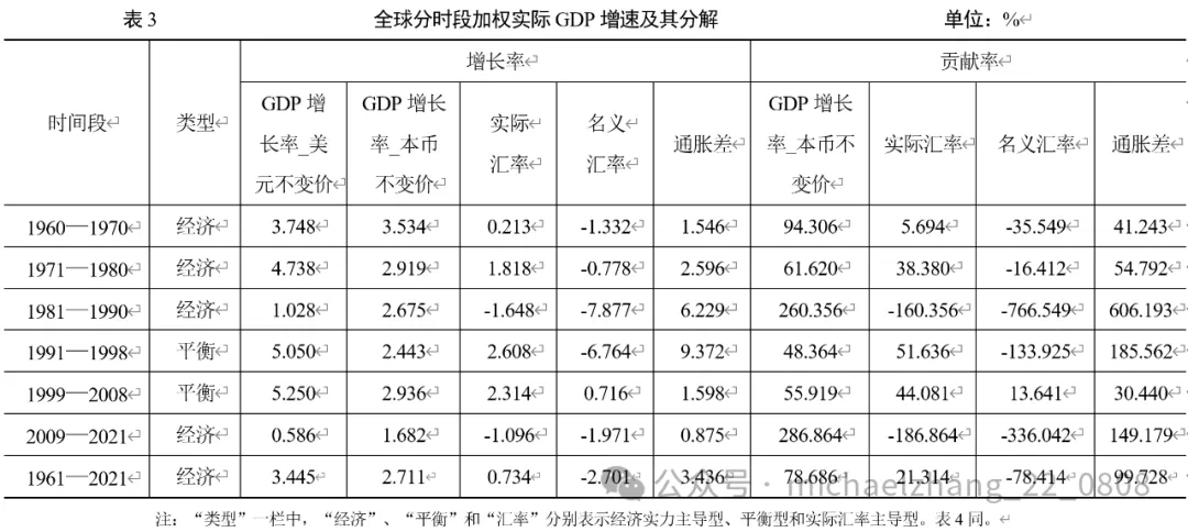 统计上看,实际汇率对经济总量跨越的平均贡献度约二至四成。表2结果显示,1960年以来全球以本币计价的年均实际GDP增长率为3.57%,实际汇率升值2.45%,最终使美元计价的实际GDP增长率为6.02%,从贡献度来看,实际汇率贡献度为40.64%。表3加权数据所示,在考虑不同经济体经济规模后,实际汇率升值幅度降至0.73%,贡献度显著下降至21%。