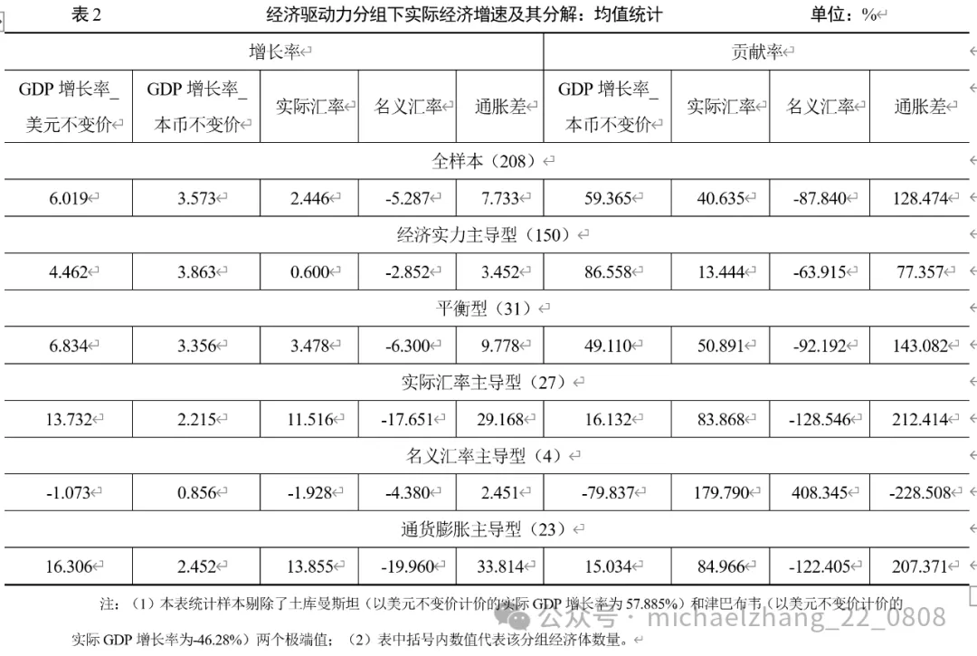 为甄别实际GDP赶超的驱动力,本文按各经济体经济驱动力进行分组。根据以美元计价下实际GDP增速中以本币计价实际GDP增速和实际汇率贡献度的不同,本文将各国分为经济实力主导型经济体、实际汇率主导型经济体和平衡型经济体三类。具体分类标准为:如果以本币计价下GDP增长率贡献度低于40%,则为实际汇率主导型经济体,如在41—60%之间,则为平衡型经济体,超过60%为经济实力主导型经济体。另外,根据实际汇率变动中名义汇率和通货膨胀贡献度大小,本文将其进一步分为名义汇率主导型经济体和通货膨胀主导型经济体。