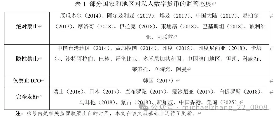 鉴于私人数字货币引发的种种风险,包括IMF、FSB、世界银行、BIS等在内国际组织以及学术界都在持续呼吁增强和完善对私人数字货币的监管。其中,Bryans(2014)是较早对比特币监管进行讨论的学者之一,其认为应该采取适当的法律行动来限制比特币用于洗钱等非法行为。FSB则持续更进私人数字货币的发展和相关风险,并就各类风险提出了针对性监管政策建议(FSB,2019;2022;2023)。而反对的声音更多来自私人数字货币业界,其认为加强监管可能违背了去中心化的初衷,导致私人数字货币变得更加集中化,并可能对技术和金融创新产生阻碍作用。