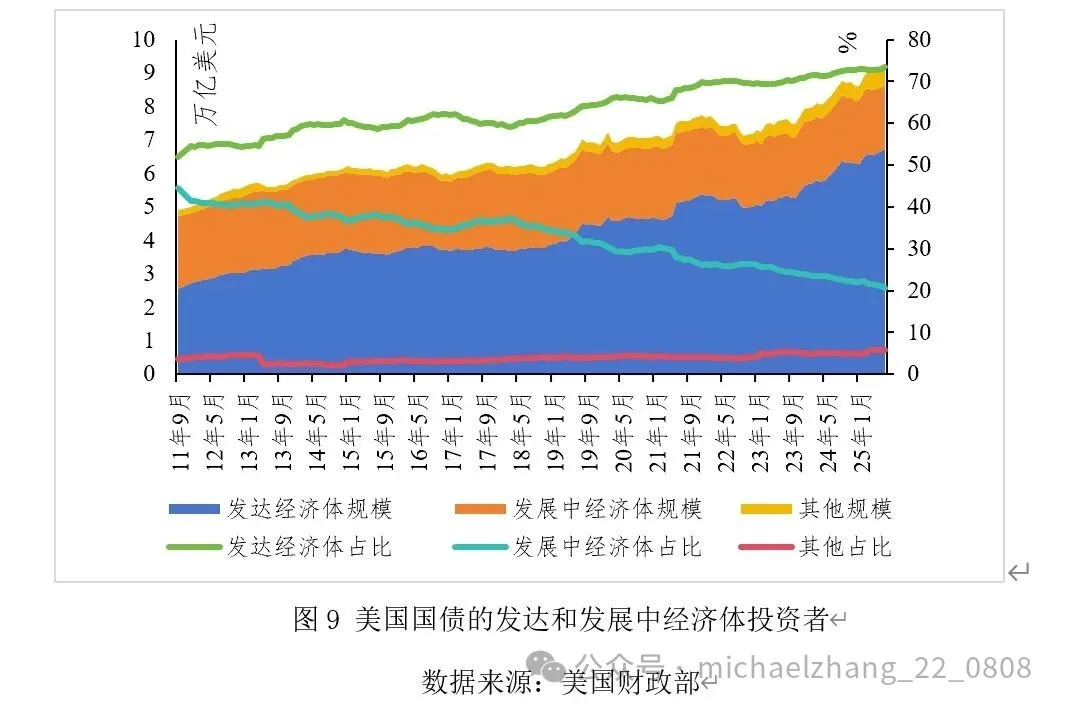 发展中经济体的减持与发达经济体的增持形成对比,可能基于以下两方面原因。一方面,近年来美国频繁将美元及金融体系武器化,对特定国家实施金融制裁,严重侵蚀美国国债作为安全资产的国际声誉,使发展中经济体出于预防地缘政治风险和保障国家金融安全的战略需要,积极推动“去美元化”进程。另一方面,尽管存在风险,但在全球范围内,能替代美国国债的优质安全资产仍稀缺。对于发达经济体而言,美国国债市场无与伦比的深度和流动性、相对较高的收益率,以及稳固的政治同盟关系,共同构成了其难以抗拒的吸引力。因此,发达经济体依然将美国国债作为全球资产配置的核心组成部分。
