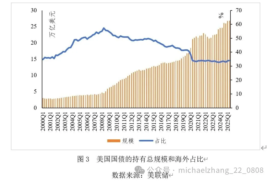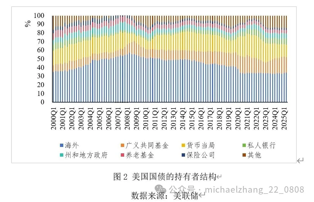 截至2025年第二季度,各类机构和个人投资者累计持有美国国债26.84万亿美元,相较2000年第一季度的3.04万亿美元实现了爆发式增加。美国国债市场的持有者结构呈现出高度多元化的特征,形成了一个由国内外各类机构共同支撑的庞大债权体系。