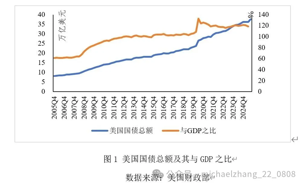 美国国债规模扩张势头不减,再度达到历史顶点。近年来,美国国债数量猛增,2025年10月30日的存量总额高达38.11万亿美元,相较于2024年底的36.22万亿美元已扩张近2万亿美元(见图1)。新冠疫情以来,美国国债与美国GDP之比持续保持在高位水平,截至2025年第二季度达118.78%。