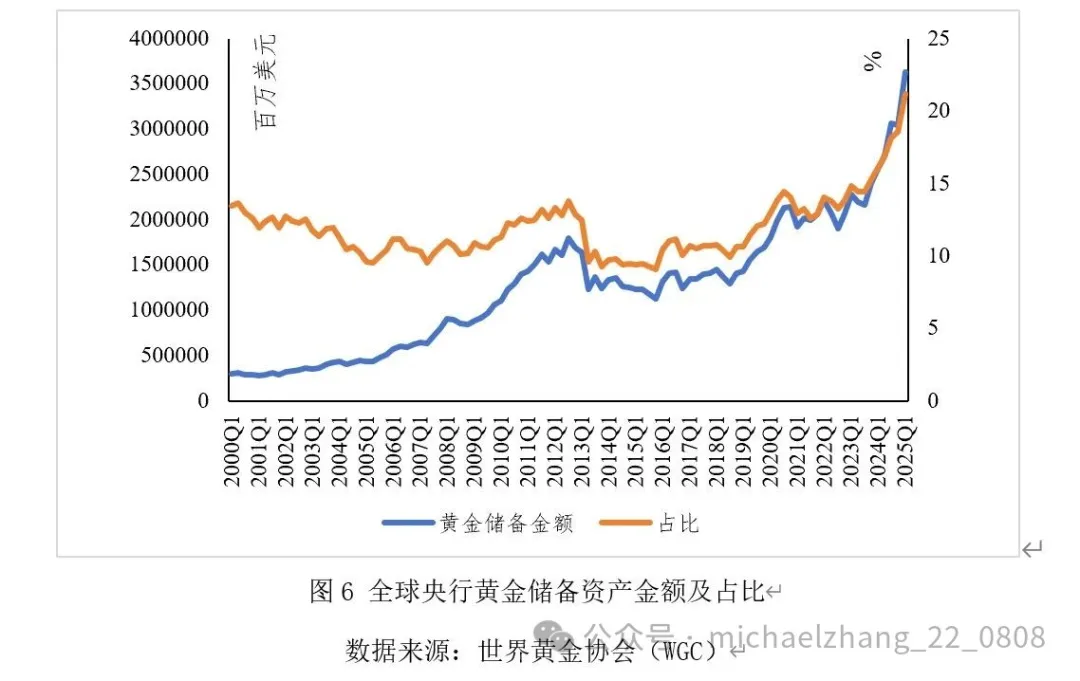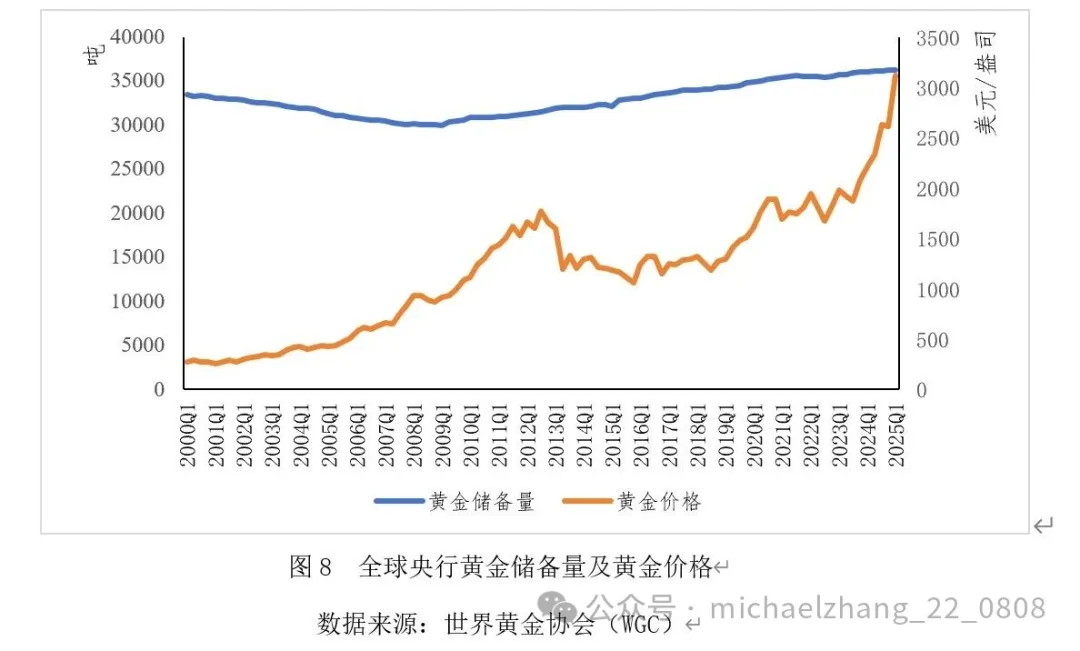 海外官方投资者大幅减持美国国债的可能原因在于海外央行致力于外汇储备的多元化,通过将美元储备资产转换为黄金储备资产,增强外汇储备的安全性、抵御金融动荡并减少对单一主权货币的过度依赖。1999年以来,全球官方美元储备资产呈波动中下降趋势,从1999年的48.69%增至2018年53.24%的峰值,后减至2024年的45.22%。而全球黄金储备资产额从2013年第二季度的1.23万亿美元增至2025年第一季度的3.63万亿美元,2024年占总储备的比重达20.67%(见图6),高于欧元的15.52%,成为2024年按市场价格计算的第二大全球储备资产(见图7)。但近年来黄金储备的大规模增加存在价量双升且价升为主导的特点:黄金价格与黄金储备资产额的上升趋势基本一致,2013年第二季度为1192美元/盎司,2025年第一季度飙升至3115美元/盎司,增长1倍多;同期黄金储备量的增速则仅为13.16%(见图8)。