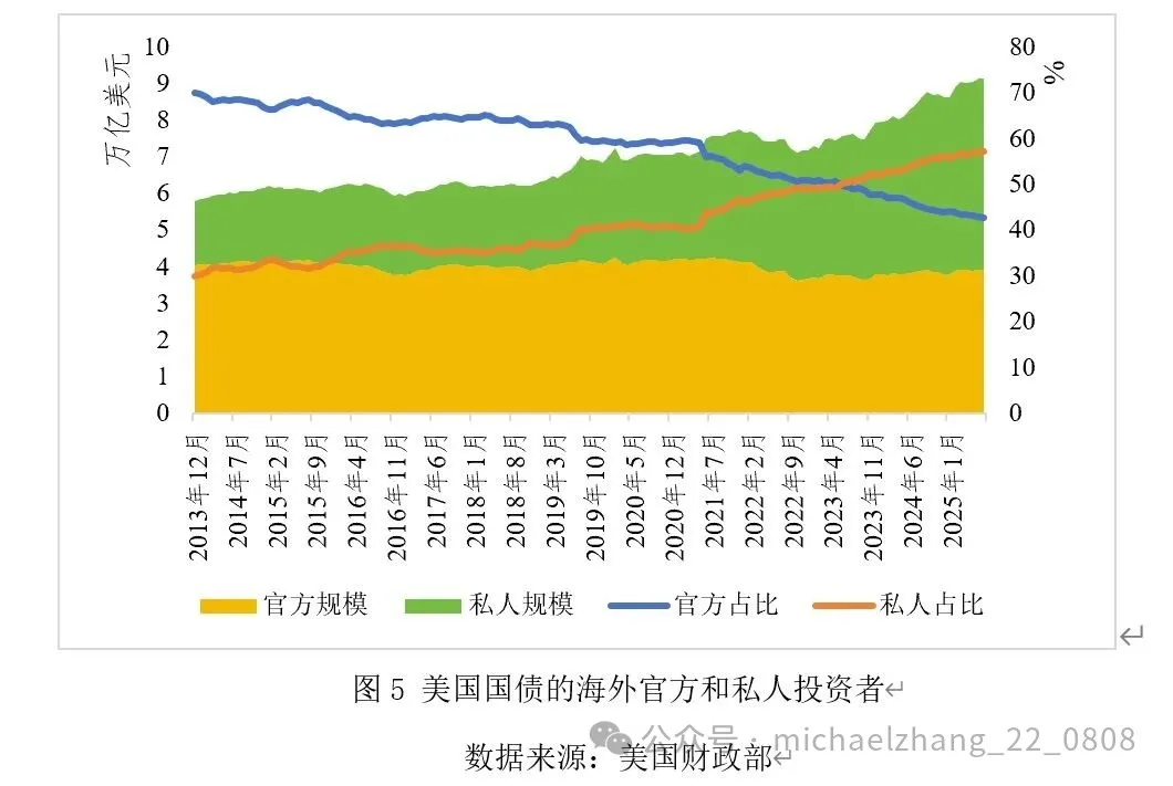 一是从官方和私人投资者的划分来看(前者通常指的是外国政府、央行和主权财富基金等官方机构。后者则是指除官方投资者之外的其他海外投资者,如企业、金融机构、基金及个人投资者等。),前者的持有规模从2013年12月的4.05万亿美元减少至2025年7月的3.92万亿美元,降幅为3.22%;而同期后者的持有规模从1.74万亿美元飙升至5.24万亿美元,增速高达201.21%,表明美国国债海外持有规模的增加主要靠私人投资者的增持主导。私人投资者持有占比大幅上升,从2013年12月的30%攀升至2023年6月的50.16%,为首次超过官方投资者占比,随后又迅速拉大与后者间的差距,跃升至2025年7月的57.16%(见图5)。
