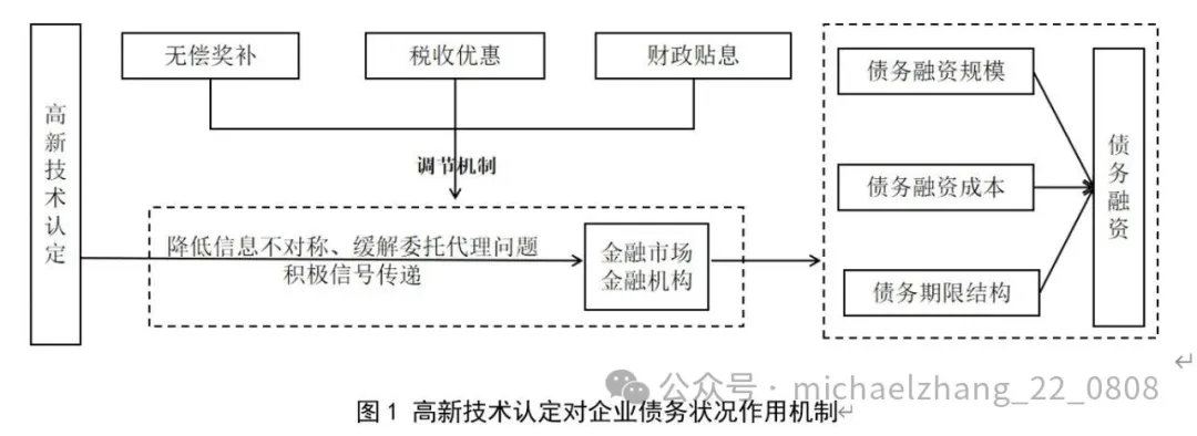 为促进高新技术企业发展,我国政府配套出台了税收优惠、无偿奖补、财政贴息三类财税政策,与金融市场、金融机构形成联动,放大了高新技术企业认定在降低信息不对称、缓解委托代理问题、传递积极信号方面的正向效应,有效推动企业债务融资,为其创新发展提供了资金保障(见图1)。