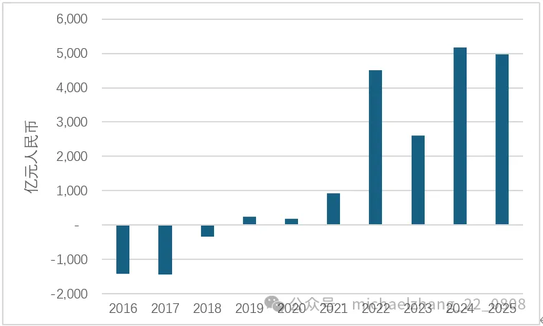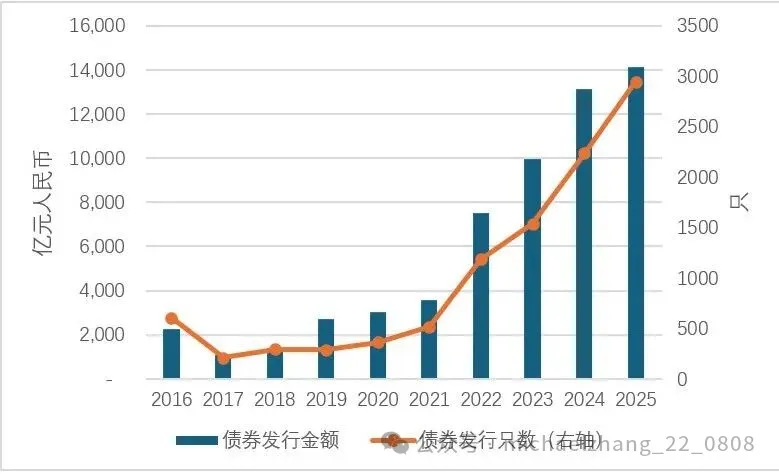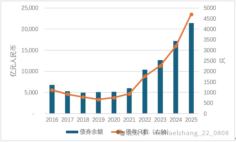 如图1所示,点心债市场在2019年回暖,并从2022年起进入快速增长阶段。2022年至2025年,点心债年度发行规模分别为7499亿、9944亿、13127亿与14123亿元,发行只数分别为1186、1539、2236与2948只。如图2所示,从2022年起至今,点心债年度余额迭创历史新高,2022年突破1万亿元达到10429亿元,2025年突破2万亿元达到21447亿元。如图3所示,点心债年度净融资额在2016年至2021年期间累计为-1851亿元,但在2022年至2025年期间分别为4516亿、2601亿、5177亿与4969亿元。